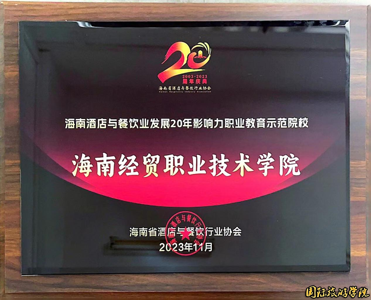 图1:388vip太阳集团荣获“海南酒店与餐饮业发展20年影响力职业教育示范院校”