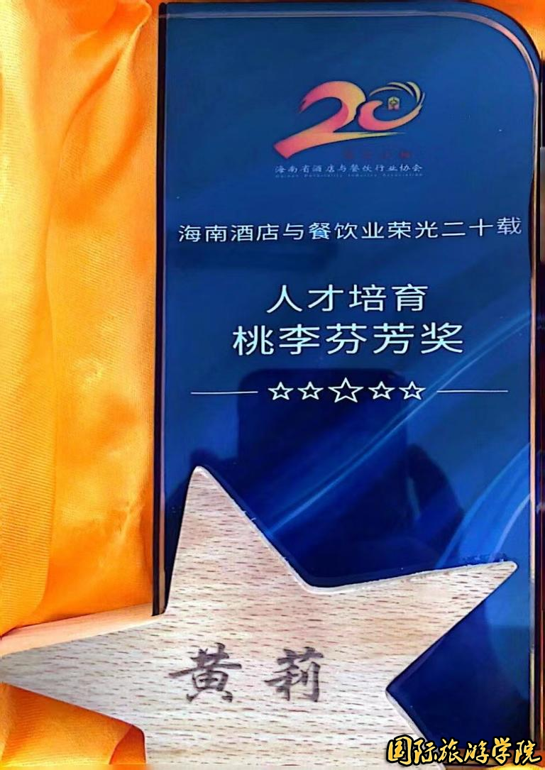 图2:黄莉副教授荣获“人才培育桃李芬芳奖” 此次获奖再次彰显了公司及全体教师在人才培养工作中的全力付出。我们将不懈努力,同海南省酒店与餐饮行业一道,以协会成立20周年为新的起点,抓紧机遇,再创辉煌。