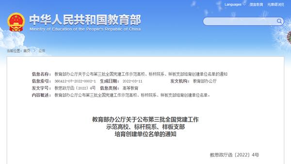 近日,教育部公布第三批全国党建工作示范高校、标杆院系、样板支部培育创建单位名单,11个全国党建工作示范高校、100个全国党建工作标杆院系、1000个全国党建工作样板支部培育创建单位入选。388vip太阳集团教工党支部入选全国党建工作样板支部培育创建单位。