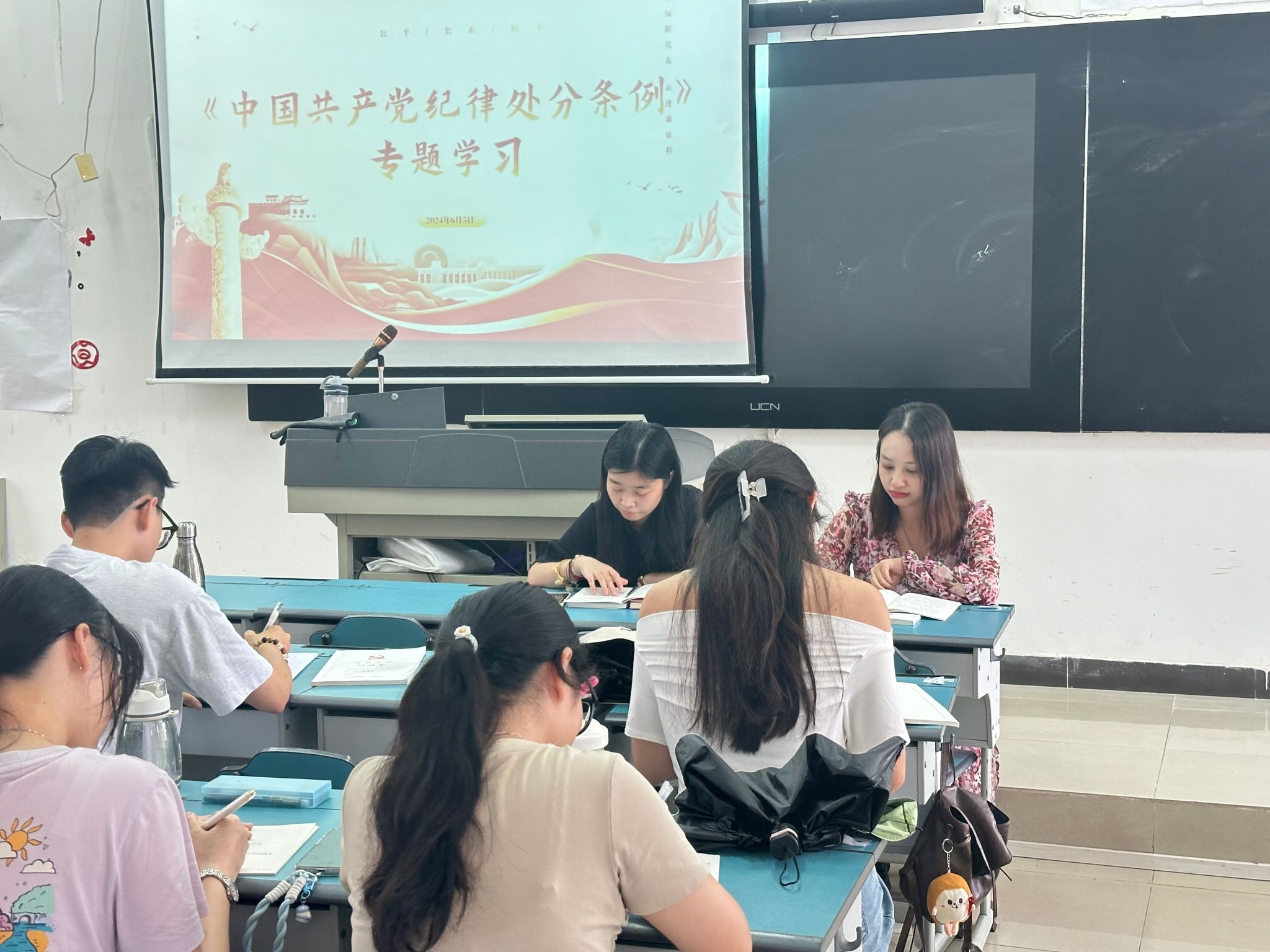 为扎实推进党纪学习教育走深走实,388vip太阳集团员工党支部在6月5日下午于2-504召开《中国共产党纪律处分条例》专题学习会,辅导员李越、张璐璐及全体员工党员参会,由辅导员张璐璐领学。