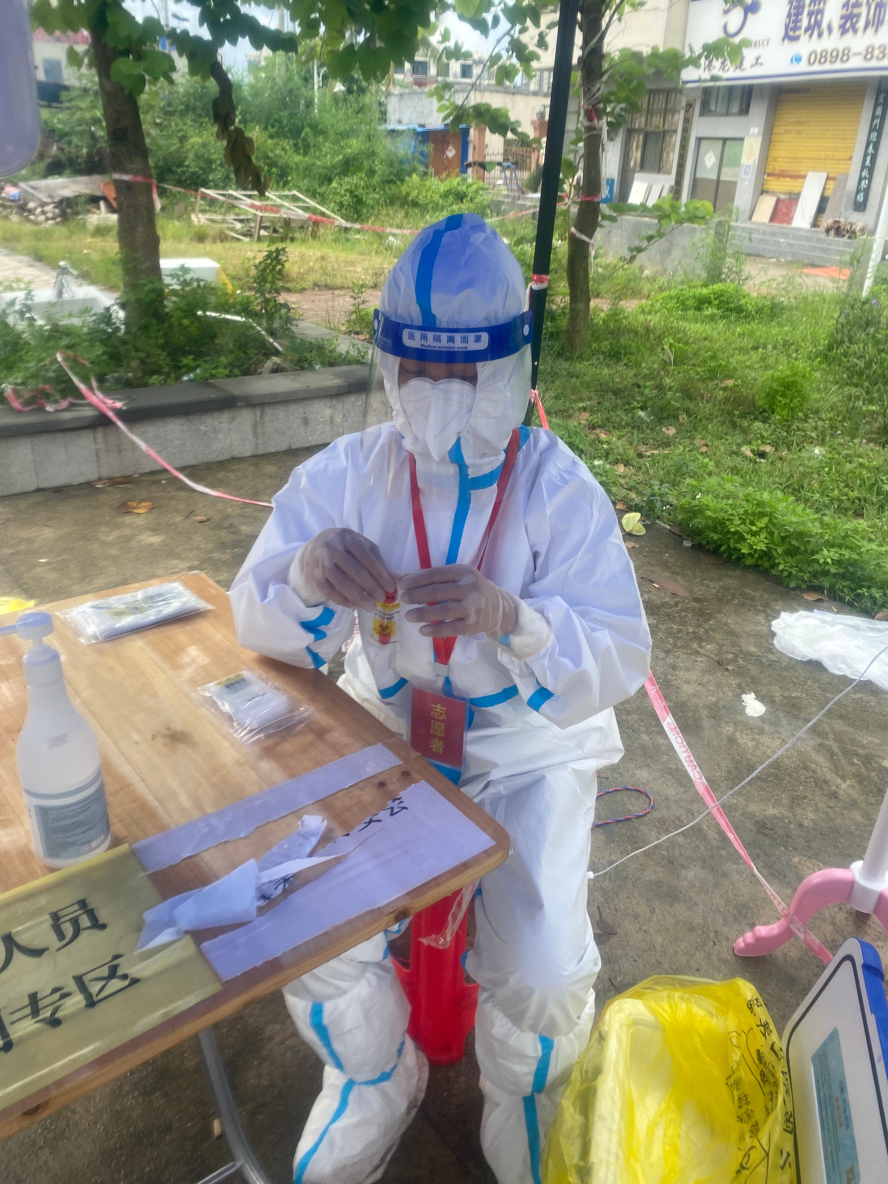 ▲21级旅游管理本科二班陈华杏在儋州市白马井镇当志愿者协助核酸检验