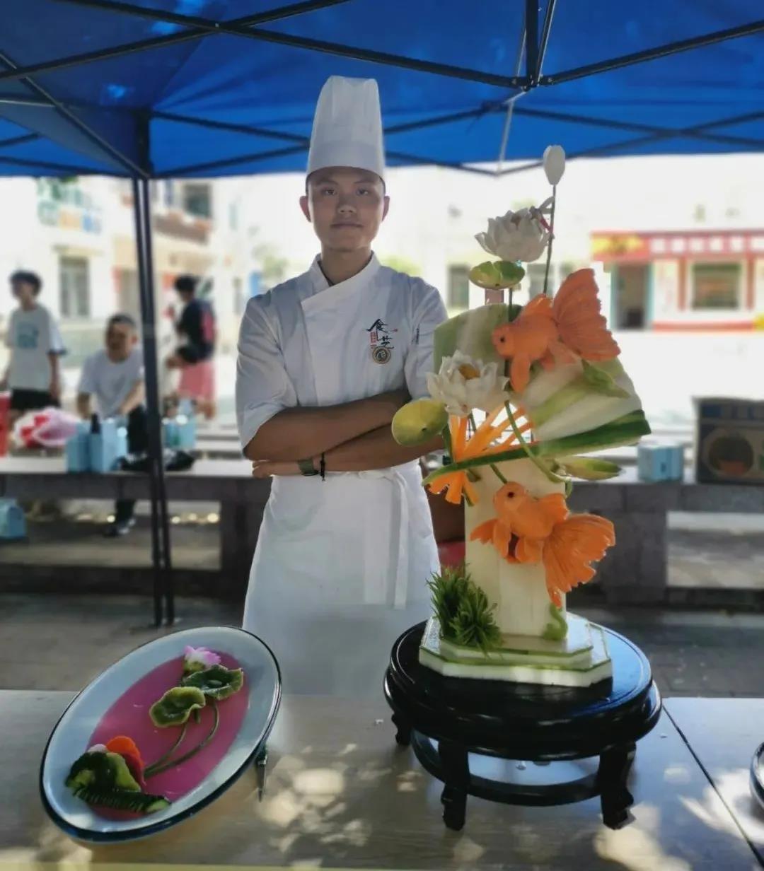 柴国鹏,2019级烹饪工艺与营养专业员工。一刀一锥,妙手生花,食品雕刻是他的拿手绝活。2016年还在上中专的他,受师傅启发喜欢上了食品雕刻,从此开启了他的雕刻人生。他说,“食材经过雕刻才能成为艺术品,正像我的人生一样,需要经过苦难雕琢,方能绽放青春之花。”