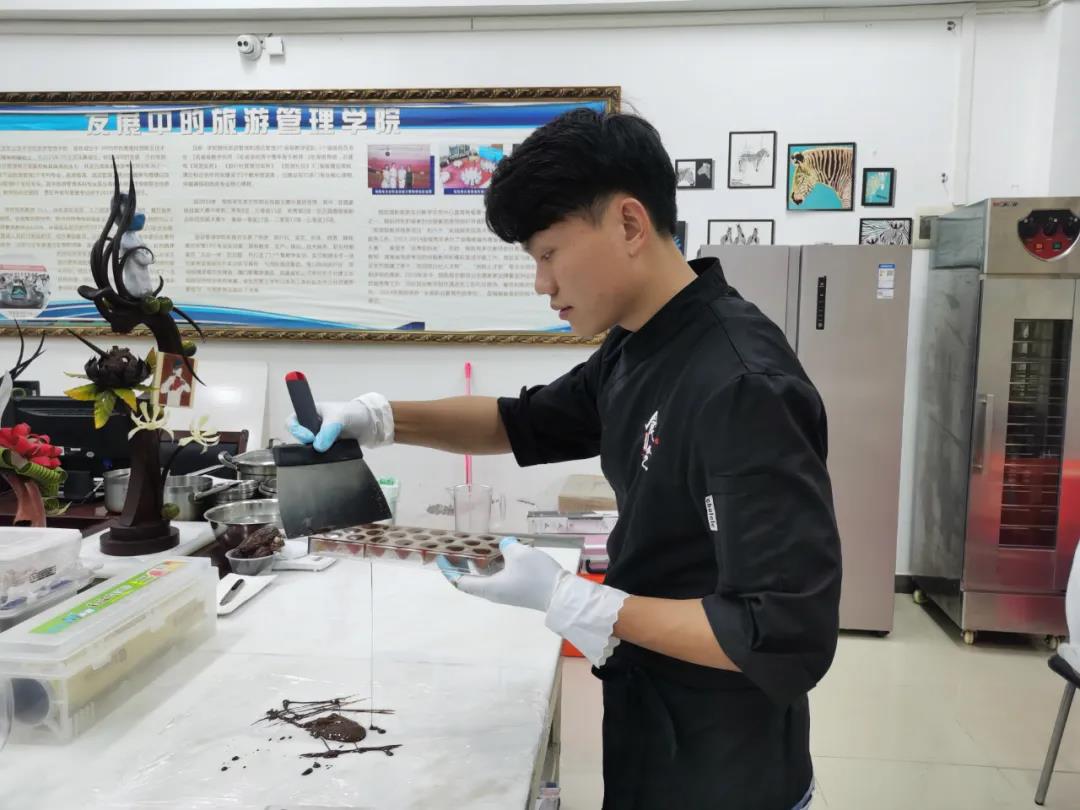 大学两年,他在二教五楼的烹饪实训室度过了很多时光,思考关于专业学习问题、完成老师给出的雕刻设计与任务。勤奋努力,天赋异禀的他很快受到了专业老师的关注。经过一年多时间的集训和自主学习,他的取得的成绩稳步上升。他先后代表海经贸参加海南省“糖艺西点”大赛并荣获海南省赛区第一名;代表海经贸参加海南省职业院校技能大赛“高职组”烹饪大赛并荣获第一名;最终代表海南省参加全国职业院校高职组“烹饪”赛项团体赛并荣获一等奖。面对成绩,他曾坦然说到,目前在实习工作期间他仍保持每天十二小时的工作与学习。他始终把勤奋学习作为人生进步的重要阶梯,学习不是为了眼前的成绩,是为了未来的幸福,学习不是一时的,而是终生的。此外,兼职的工资、申请的助学金、比赛奖金解决了学费和生活费的难题,暂时不需要为钱发愁。剩余所得,将用于照养家人,回馈曾经帮助过他的人。