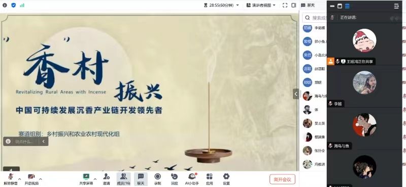 本次竞赛设有包括科技创新和未来产业、乡村振兴和农业农村现代化、城市治理和社会服务、生态环保和可持续发展、文化创意和区域合作五个类别主题。比赛采用线上的形式,分为“路演展示”和“评委提问”两个环节。各参赛团队通过PPT讲解、视频演示、成果展示等多种形式介绍了项目建设的背景与意义、项目的开展情况和项目成果。专家评审从社会价值、实践过程、创新意义、发展前景等方面进行了点评,并就项目的创新点、可行性、现实意义等方面进行了提问,同时对各项目提出了针对性的改进意见及建议,为进一步优化参赛作品提供了重要参考。经过立项评审、路演、答辩,最终推选出的王旭鸿的“香”村振兴--可持续生态沉香采造技术创导者和陆勇贺的知行琼崖———自贸港琼剧研学传播创践者等8个团队参加校赛评审。