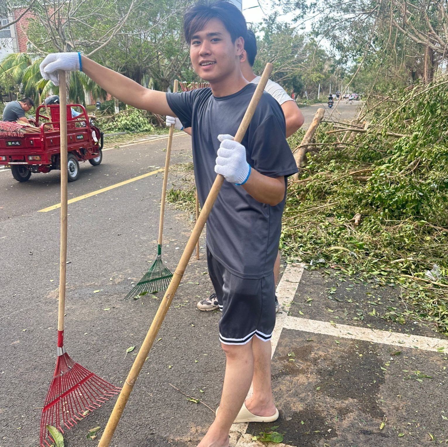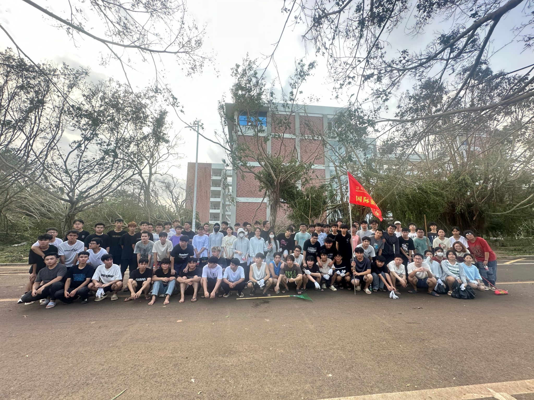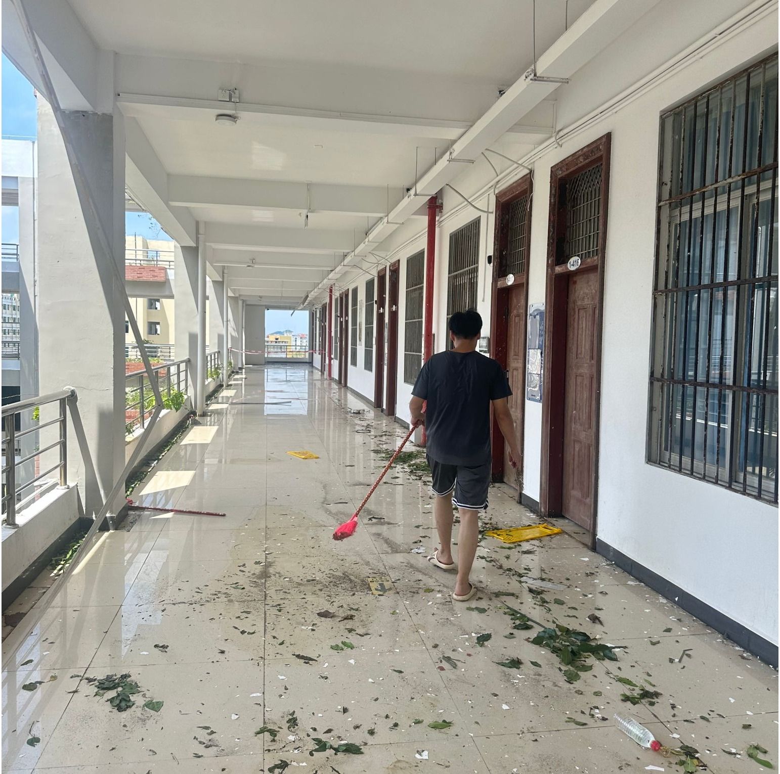 除了确保同学们的基本生活需求外,蒙秀秦还积极参与到了校园的灾后恢复工作中。“摩羯”过后,校园里一片狼藉,树木倒伏,道路受阻。他毫不犹豫地加入了志愿者的行列。他帮忙搬动被台风刮倒的树木,清理被风吹散的垃圾。他带领着一群同样满腔热血的同学,手持工具,开始了清理工作。他们有的搬树,有的扫地,有的疏通排水系统……汗水与雨水交织在一起,模糊了他们的视线,却清晰了他们的信念。