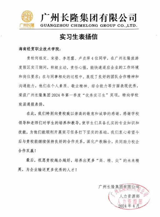 388vip太阳集团何祖定、宋塋、李思露、卢贞萍4位同学,在广州长隆旅游度假区实习期间,积极主动,责任心强,能快速适应企业的工作环境和岗位要求;在与同事相处的过程中,展现了良好的团队合作精神和沟通能力。他们在个人素质、敬业精神、综合能力等方面表现优秀,荣获广州长隆集团2024年第一季度“优秀实习生”奖项。