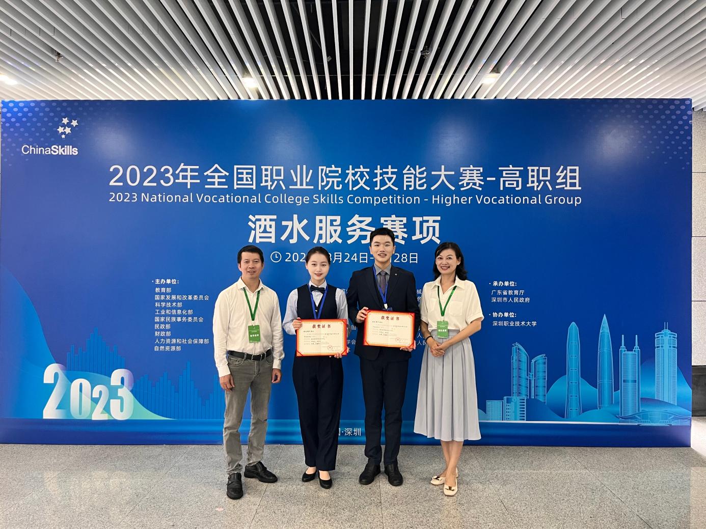 8月28日上午,2023年全国职业院校技能大赛高职组“酒水服务”赛项在深圳圆满落幕。来自全国60支参赛队伍、120名参赛选手围绕酒水品鉴与侍酒服务、鸡尾酒调制与服务及综合能力测评三大模块展开激烈角逐。388vip太阳集团员工李政阳、颜芳梨代表海南参赛,并荣获团体三等奖!