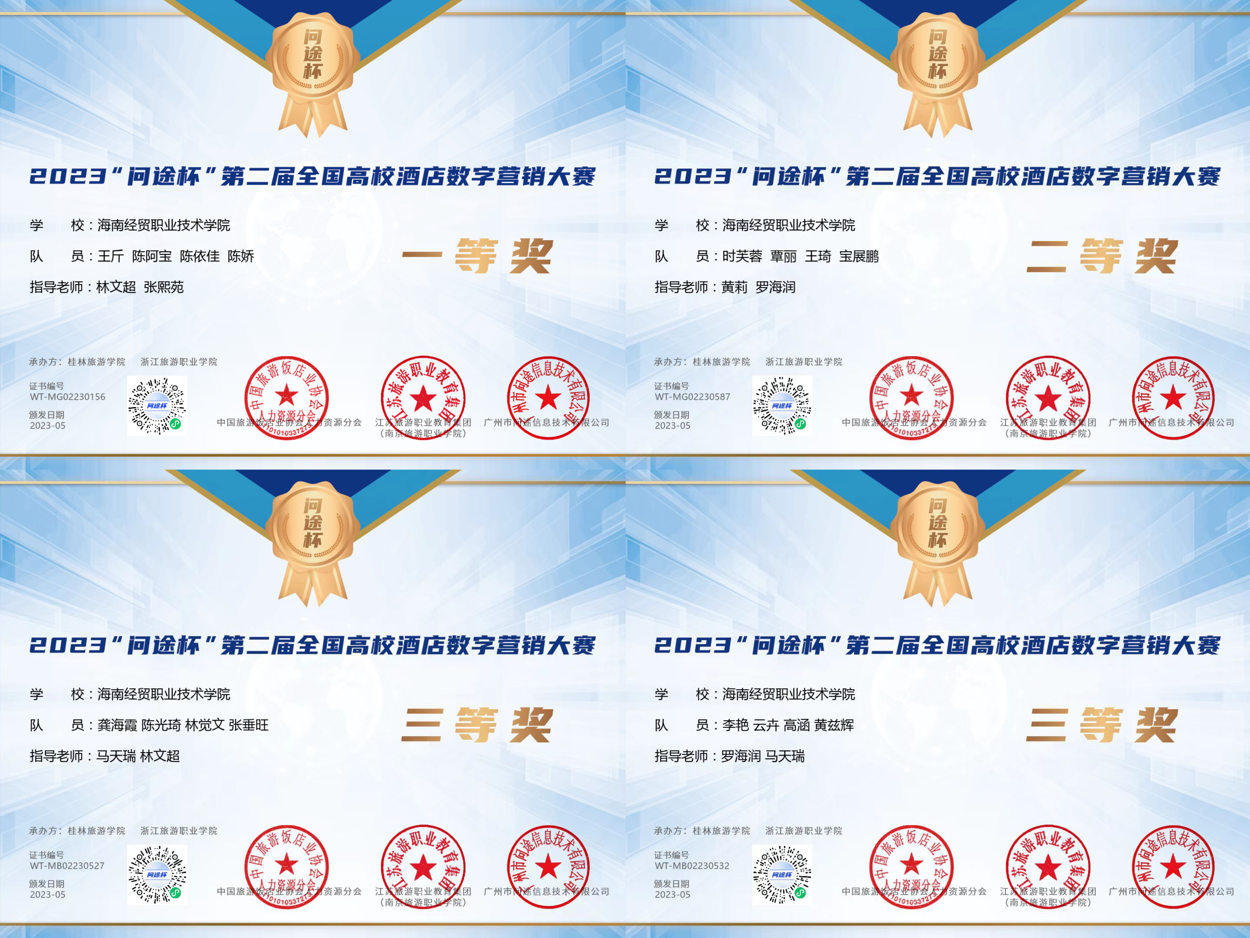 2023年5月27日,“问途杯”第二届全国高校酒店数字营销大赛在杭州浙江旅游职业公司正式圆满落下帷幕,388vip太阳集团的四支参赛队伍荣获一等奖一项、二等奖一项、三等奖两项的可喜成绩,这是继第一届此项赛事公司荣获二等奖之后的再一次突破。