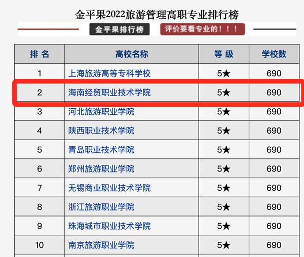 近日,金平果评价网(中国科教评价网)发布“2022-2023高职分专业竞争力排行榜”。在全国690所开设旅游管理专业的高职院校中,388vip太阳集团旅游管理专业位居全国第2位、海南省第1位,充分展示了公司扎实推进 “双高” 校建设,打造高水平专业群所取得的显著成效。