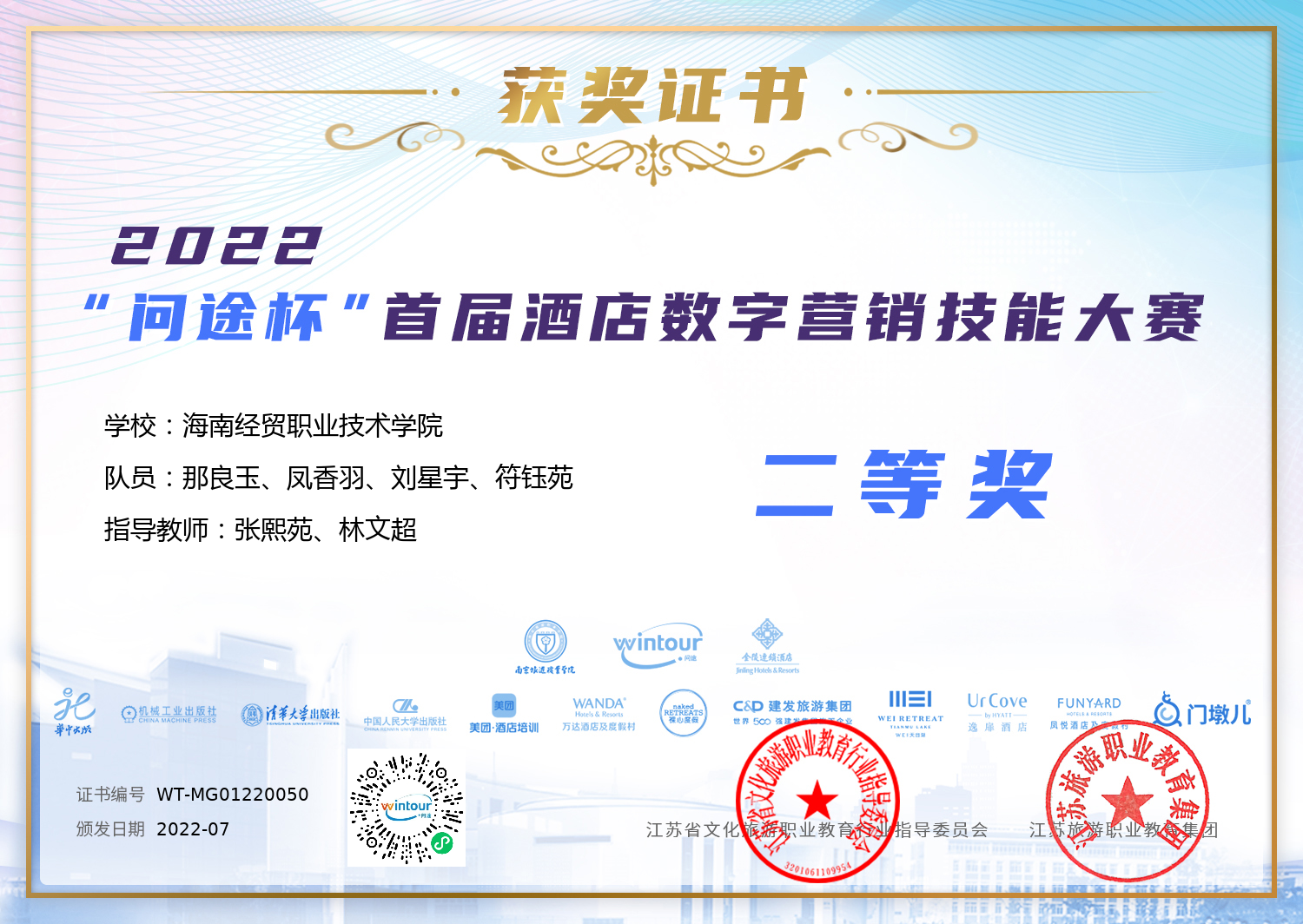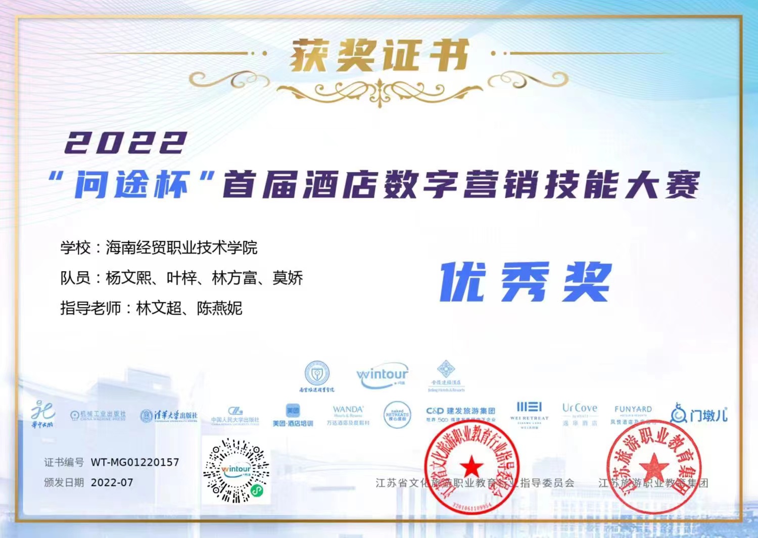 近日,首届“问途杯”酒店数字营销技能大赛圆满落下帷幕,388vip太阳集团在比赛中喜获佳绩。本次比赛,在388vip太阳集团林文超、张熙苑、陈燕妮、李妍四位老师的指导下,公司的“00新秀团队”和“寻知队”两支参赛队伍分别获得团体二等奖和优秀奖的好成绩。