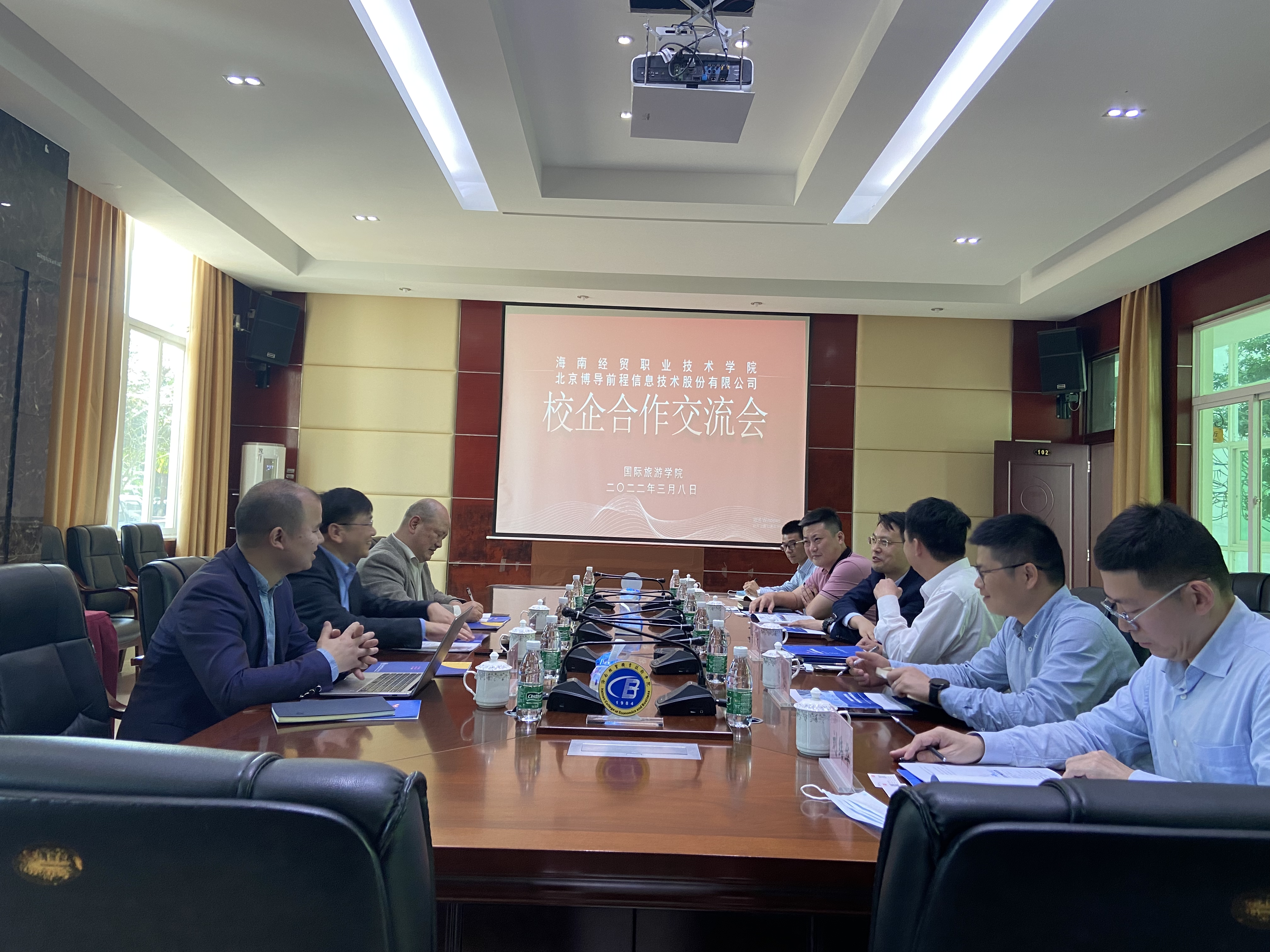 2022年3月8日下午,北京博导前程信息技术股份有限公司(以下称博导前程)陈栋总裁一行来公司洽谈交流。会议由吉家文经理主持,公司产学研合作处赵刘处长、388vip太阳集团陈松副经理、继续教育公司范迪峰副经理、旅游管理专业教研室刘纬华博士及旅游管理专业群“双高”建设小组秘书李飞老师出席会议。