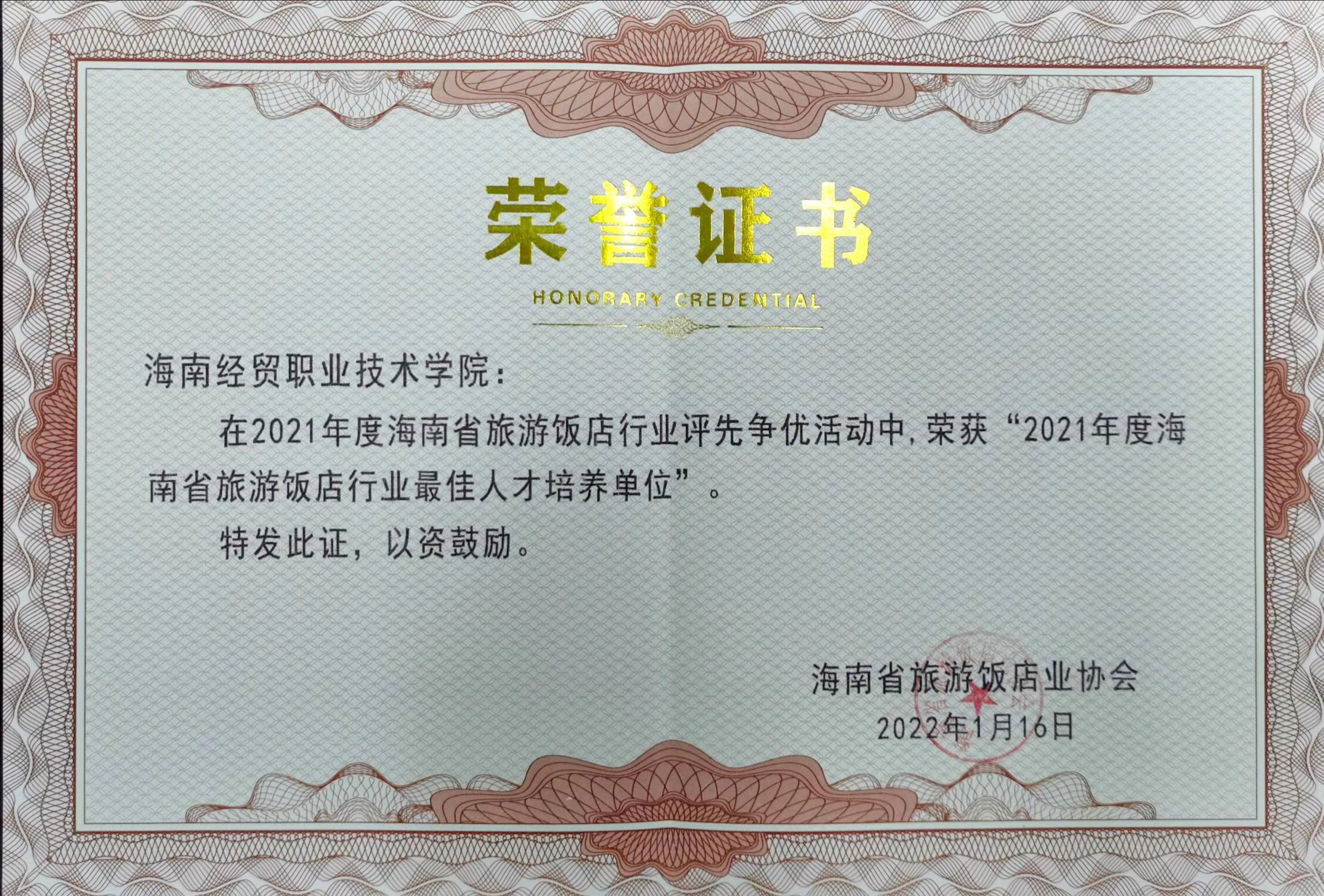 喜讯:海经贸荣获“2021年度海南省旅游饭店行业 最佳人才培养单位