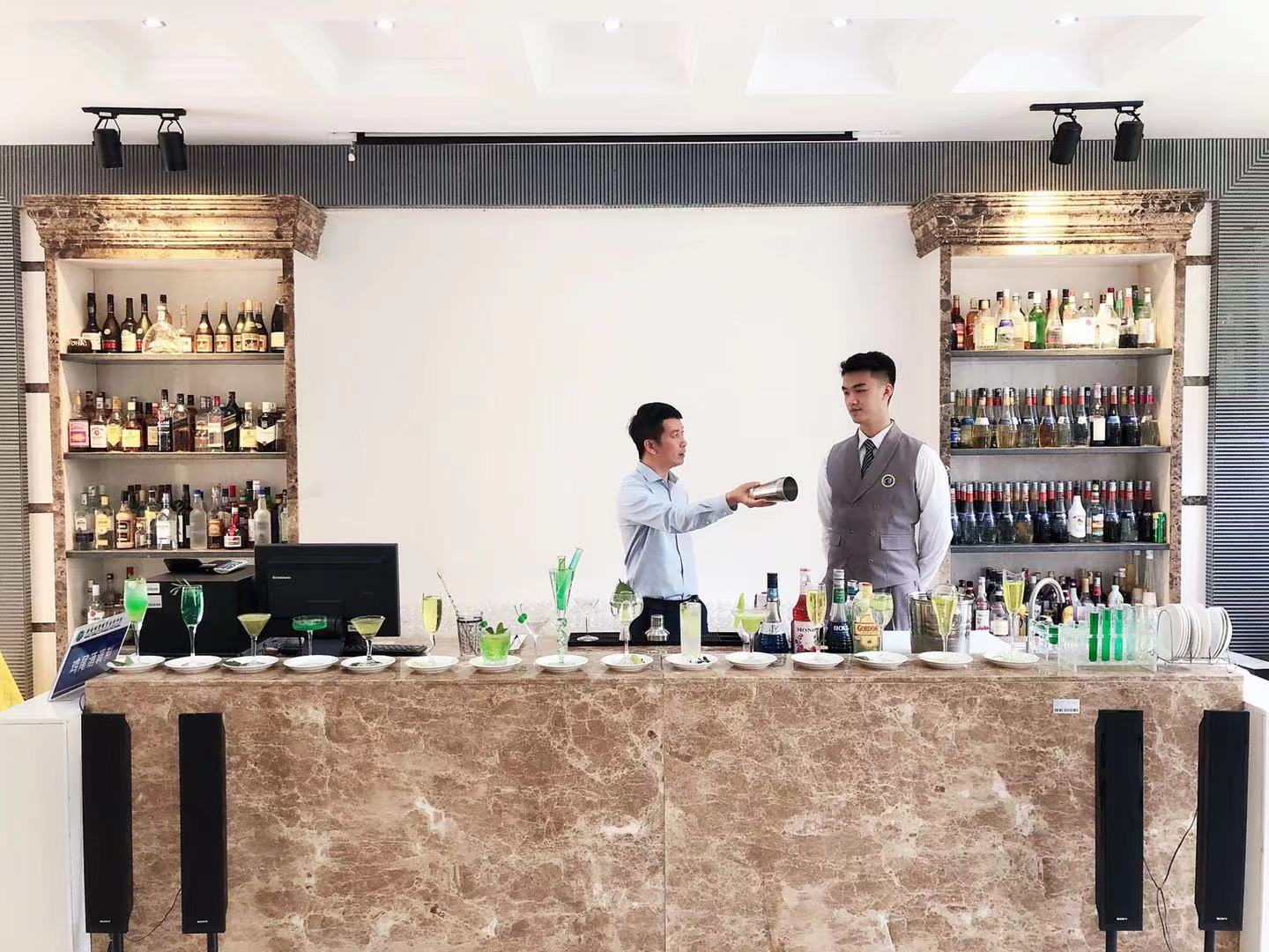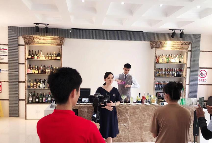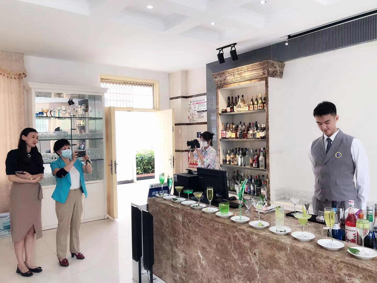 杨卿老师指导酒店管理与数字化运营专业的员工进行鸡尾酒调制展示,对现场展品装饰布置和员工技能展示细节提出详细的建议。