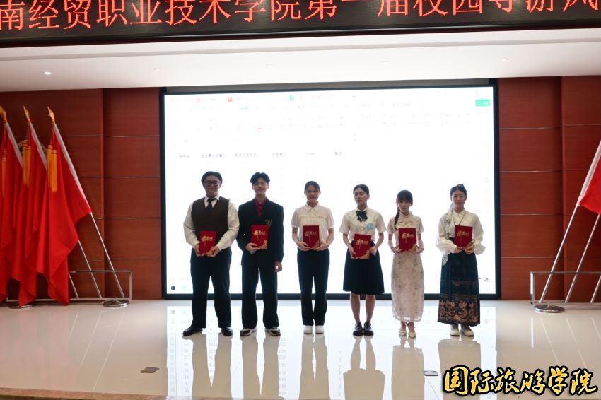 赛场上,同学们展现了海经贸学子的优良学风和精神面貌,呈现了一场精彩的赛事。在备赛过程中,同学们积极请教老师关于导游词的创作要点、舞台效果呈现,精心准备个人才艺。为了帮助员工们更好地准备比赛,组委会专门举办培训指导,由常晓芳老师现场为员工们答疑解惑,敖燕军大师为员工们详细分享比赛细节,陈嘉琪老师和李飞老师等也分别对员工进行细化指导。