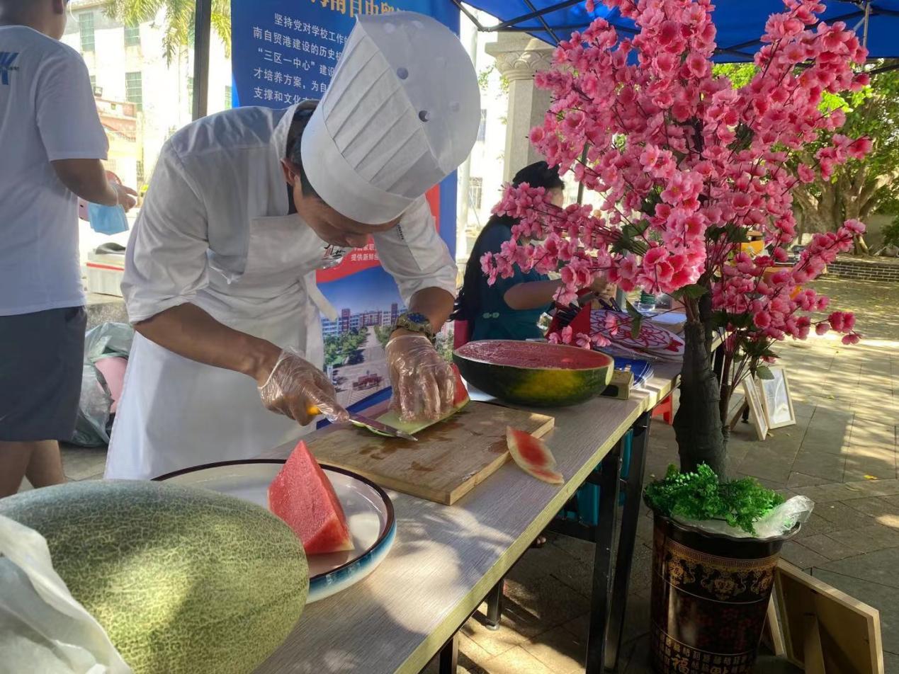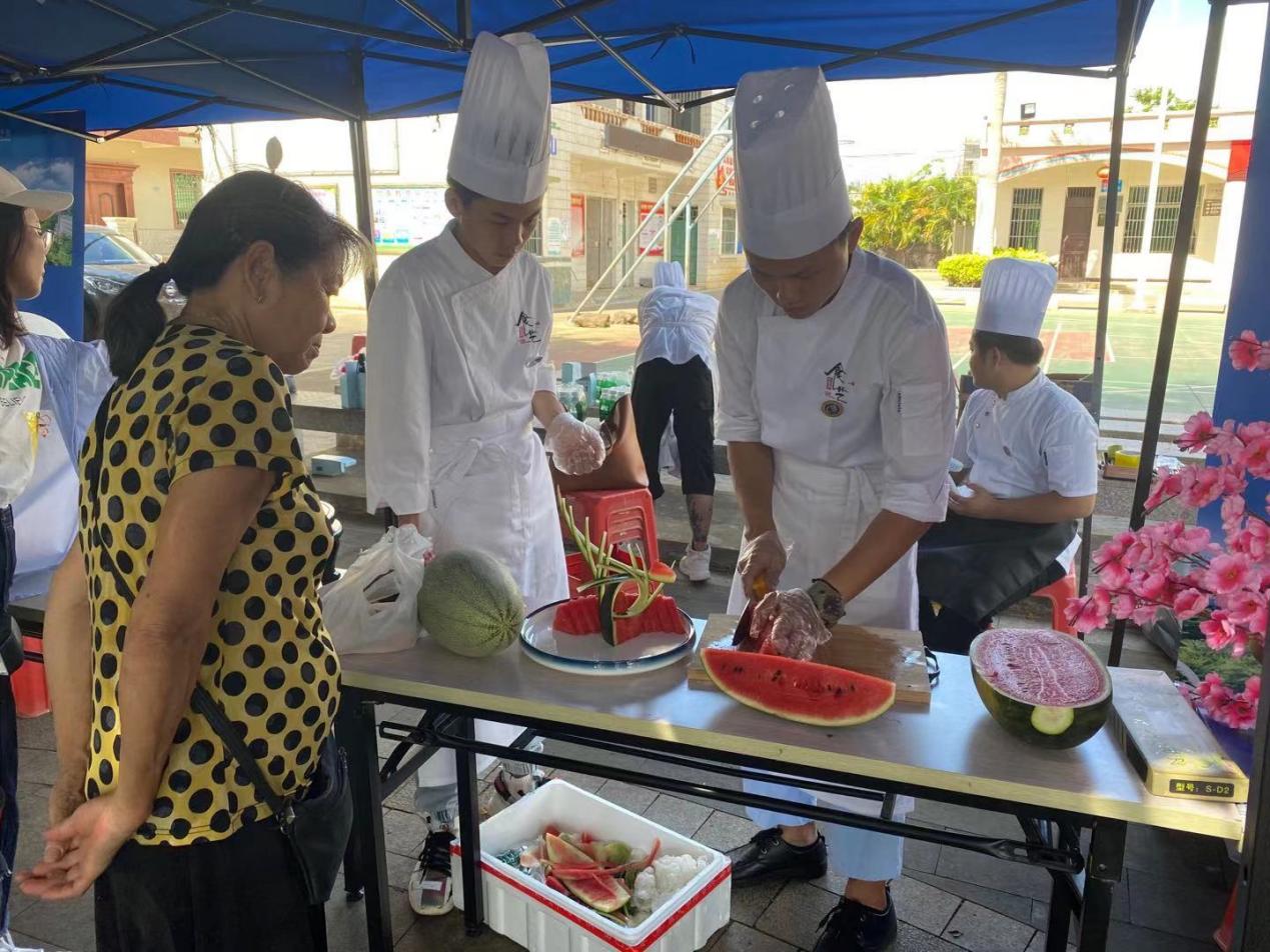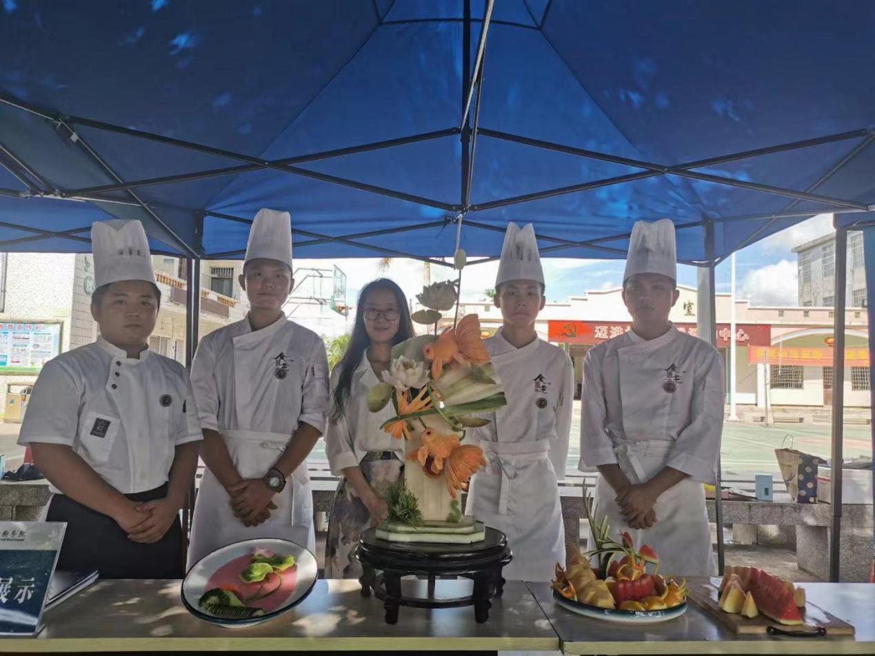 [烹饪工艺与营养专业 邰怡菘报道]2021年5月25日,388vip太阳集团职业教育活动周“技能进社区”活动在桂林洋迈德村举行。旅游管理公司烹饪工艺与营养的老师与四名同学带着工具和食材,在现场展示了刀工、雕刻和冷拼等职业技能操作,赢得了村民们的好评与喝彩。