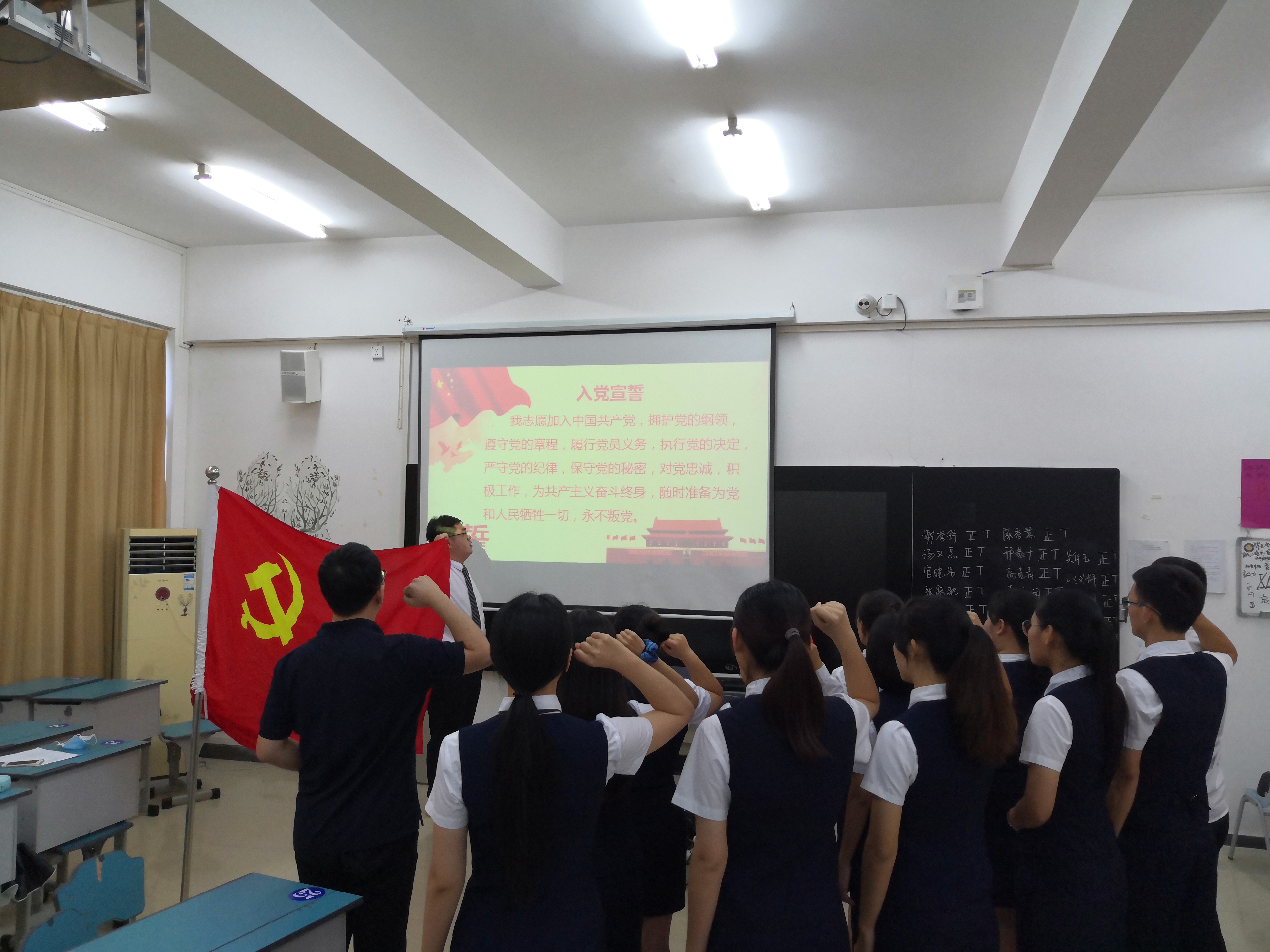 会上,各位发展对象汇报个人培养期内自己的思想、工作、学习情况、今后努力方向以及需要向党组织说明的问题。员工党支部张强老师汇报了对发展对象的审查情况,与会正式党员发表意见并表决同意接收18位发展对象为预备党员。最后大会采取不记名投票表决,该次投票符合规定,计票,监票严谨无误,张强老师宣读投票结果,全票通过了接收18名发展对象为预备党员。紧接着由张强老师带领大家在鲜红的党旗下宣读了入党誓词。