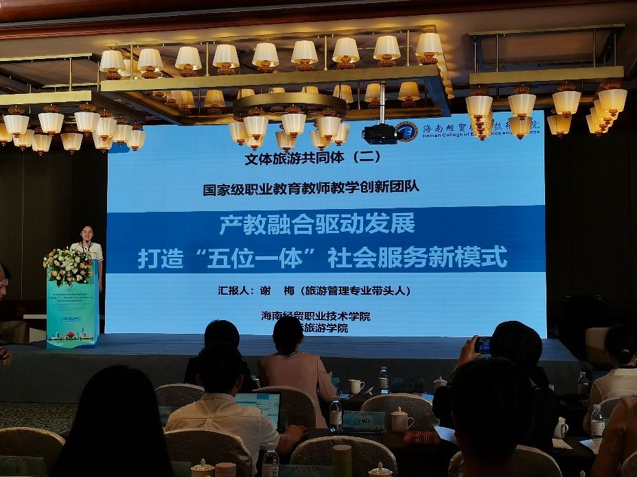 本次会议由国家级职业教育教师教学创新团队建设项目秘书处办公室副主任刘冬、青岛职业技术公司国家级职业教育教师教学创新团队负责人齐洪利教授、北京电子科技职业公司副经理辛秀兰教授,分别作了《全域视野下的国家级职业教育教师教学创新团队建设》、《攻坚克难,跨越发展——创新团队建设几个难点问题的思考》、《国家级职业教育教师教学创新团队验收标准解读》主旨讲座。此外,协作共同体12家单位依次分享了各院校团队在社会服务、教学资源库建设方面的措施与成效。谢梅老师在研讨会上代表公司分享海经贸教师创新团队在社会服务方面的海经贸经验和做法,她主要从旅游志愿服务、旅游行业职业培训服务、旅游援外培训服务、旅游研发创新服务、行业企业指导服务五个方面介绍“五位一体”社会服务模式。