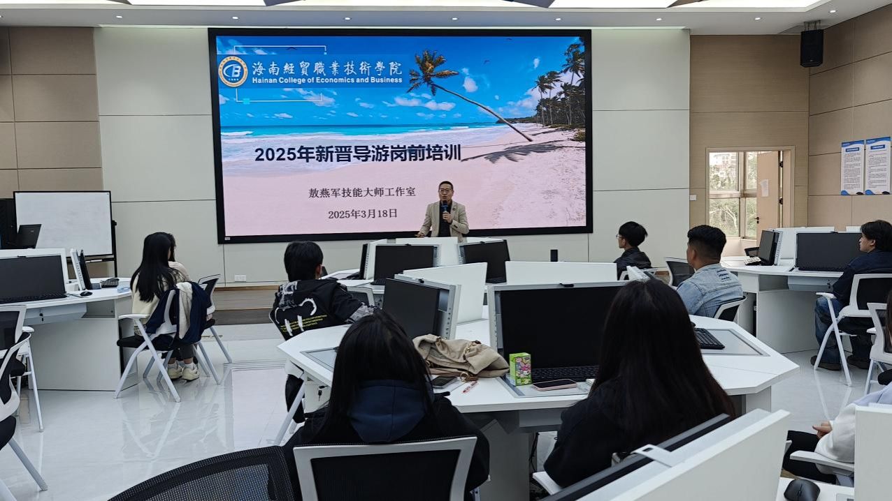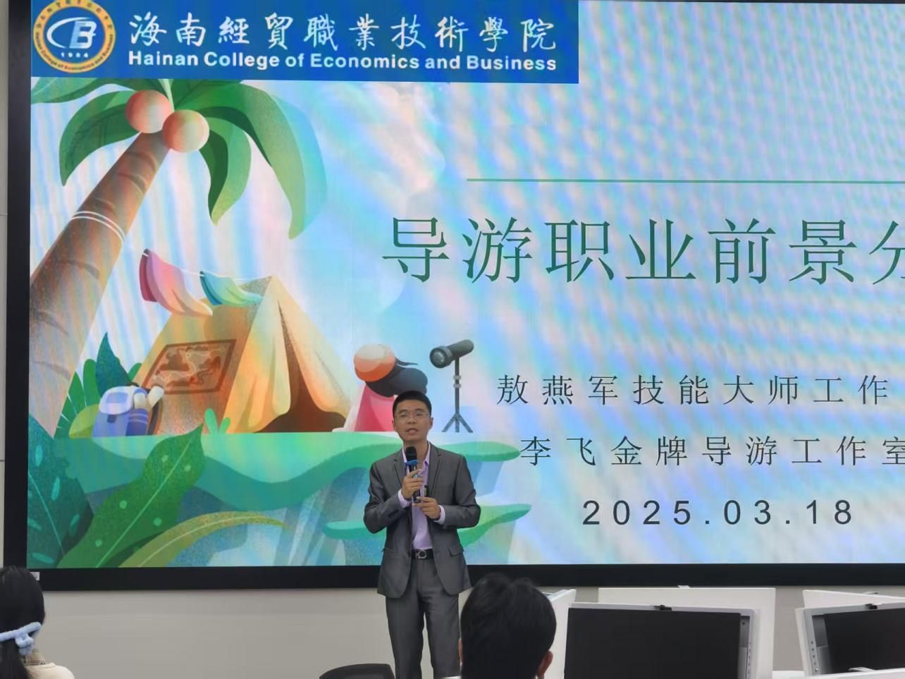 2025年3月18日,为深化校企协同育人,赋能旅游管理专业学子职业发展,海南经贸职业技术公司旅游管理专业教研室联合“敖燕军技能大师工作室”“李飞金牌导游工作室”,举办“导游证挂靠与职业前景”专题分享会。活动特邀行业领军人物、资深导师现场解读,吸引了本校师生、海南师范大学、琼台师范公司学生及社会考生等40余人参与,搭建起行业与高校的对话桥梁。