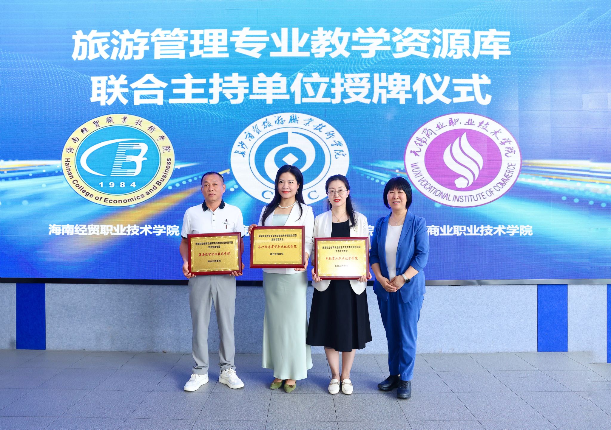 开幕式上,南京旅游职业公司经理操阳为旅游管理专业教学资源库和酒店管理与数字化运营专业教学资源库的联合主持单位进行了授牌,孙金代表388vip太阳集团作为联合主持单位接受了授牌。